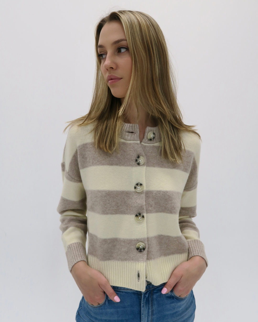 Our best-selling Nina, refreshed with a new point of view. Designed with a relaxed fit, ribbed trim, and oversized buttons, this striped version adds bold contrast to the soft, lofty cashmere you know and love.